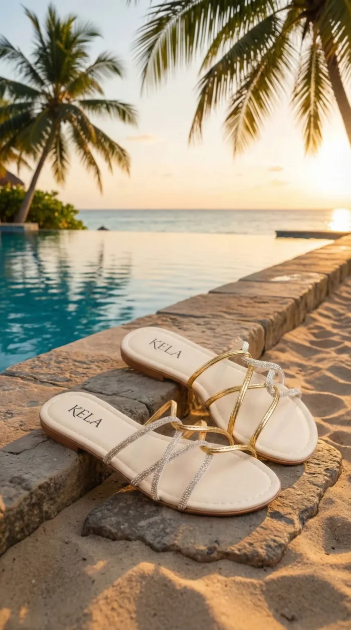 Rasteira com tiras finas douradas e prateadas em strass. Um design elegante, leve e moderno que combina brilho e sofisticação em cada detalhe.