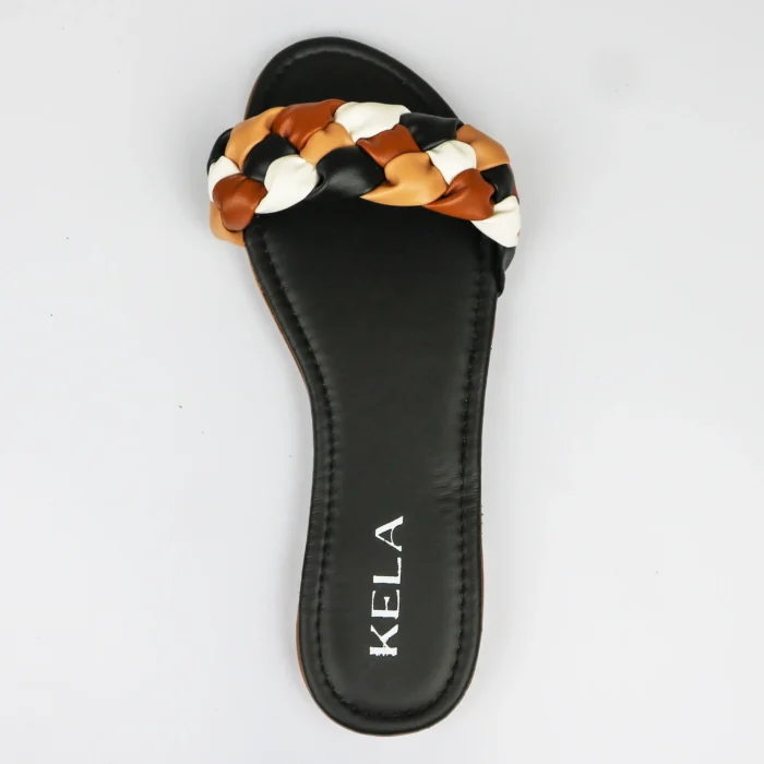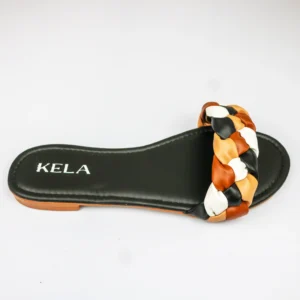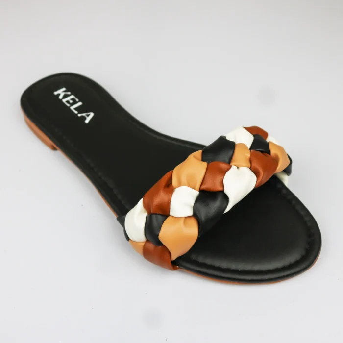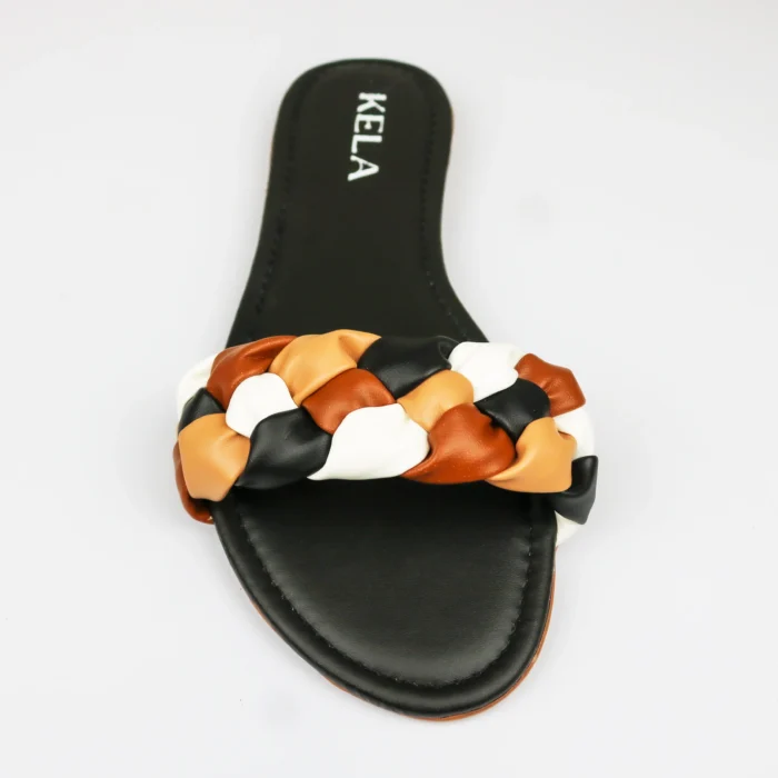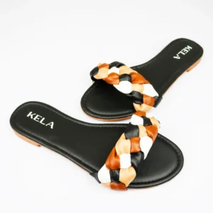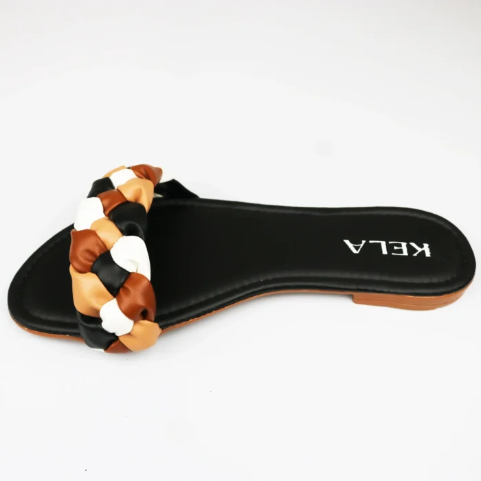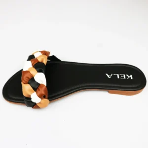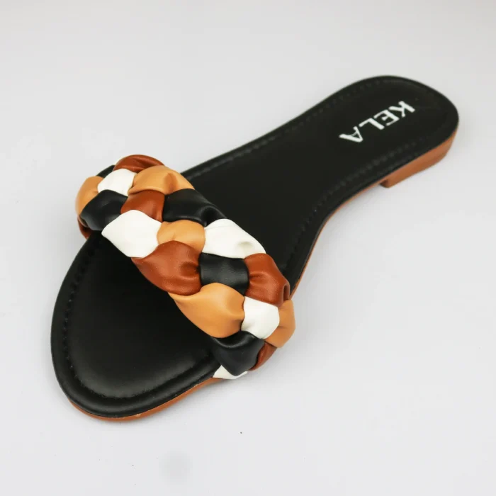 Rasteira com tira trançada multicolor em tons neutros. Moderna, confortável e versátil — ideal para quem ama estilo com leveza no dia a dia.