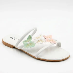Rasteira Kela Butterfly (K464). Leveza e romantismo para os seus pés! Com design delicado de tiras finas brancas, destaca-se pelo aplique de três lindas borboletas em tons pastel (verde, branco e rosa) com sutis detalhes pespontados. A palmilha macia garante conforto absoluto para o dia todo. A escolha perfeita para trazer um toque doce e super feminino aos seus looks de verão!
