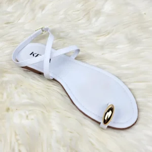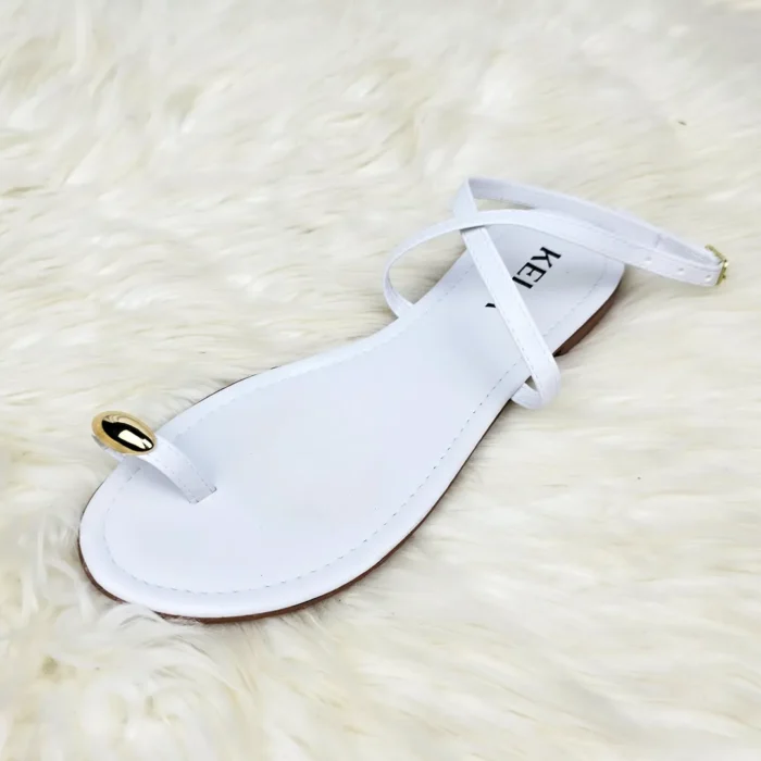 A Rasteira Kela Clássica Elegance Ring traz sofisticação em um design minimalista e atemporal. Com tiras finas brancas cruzadas no tornozelo e detalhe de anel dourado no dedo, o modelo valoriza os pés com elegância e delicadeza. Leve, confortável e versátil, é ideal para compor looks clássicos e modernos com um toque refinado.