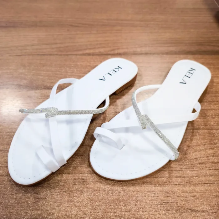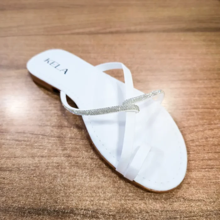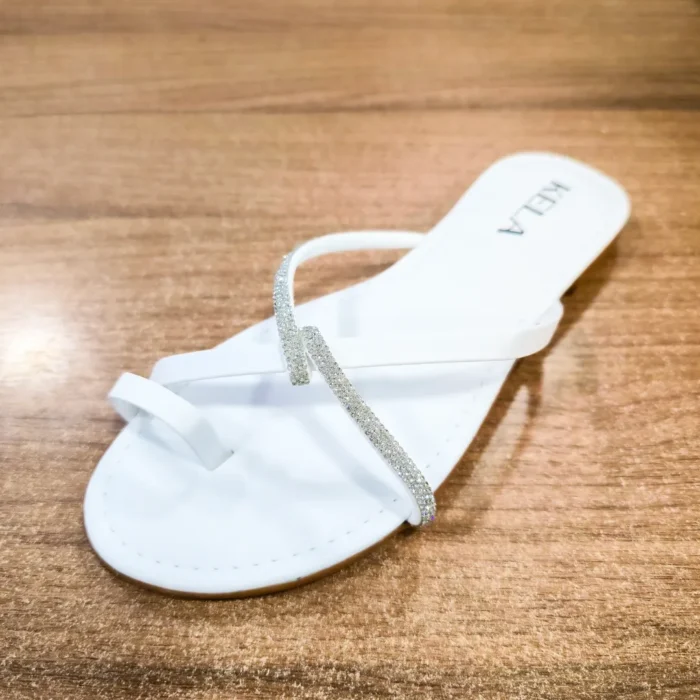 Com tiras finas brancas e delicado brilho em strass prateado, a Rasteira Kela Clássica Luz Serena é puro charme e leveza. Seu design minimalista valoriza os pés com elegância e conforto, perfeita para quem busca um toque sofisticado no dia a dia.