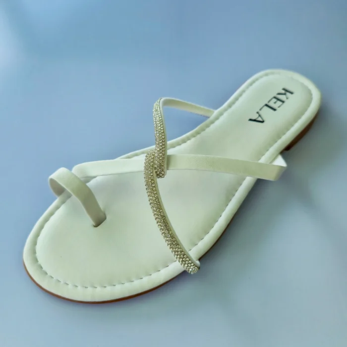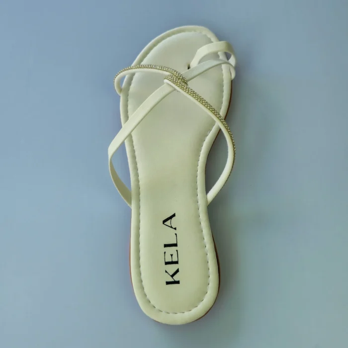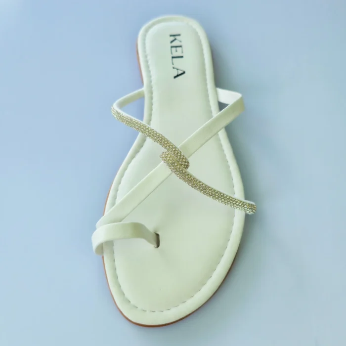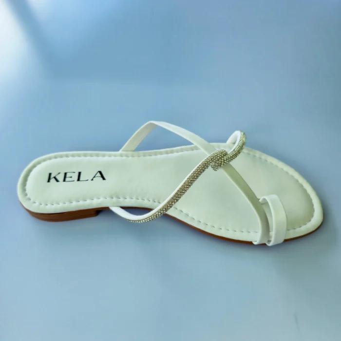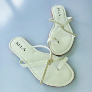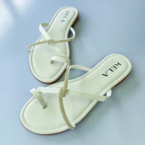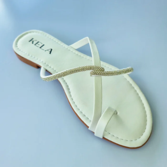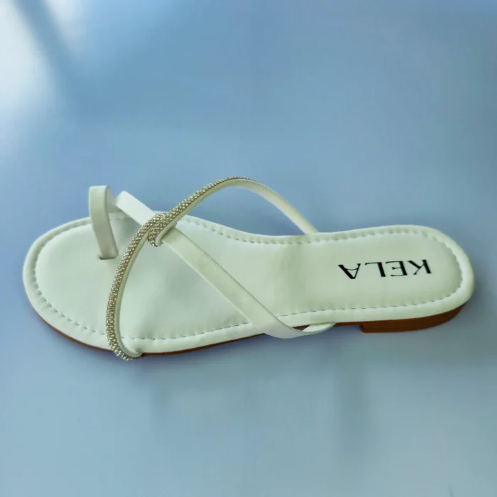 Com tiras finas brancas e delicado brilho em strass prateado, a Rasteira Kela Clássica Luz Serena é puro charme e leveza. Seu design minimalista valoriza os pés com elegância e conforto, perfeita para quem busca um toque sofisticado no dia a dia.