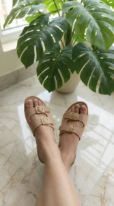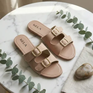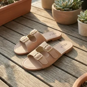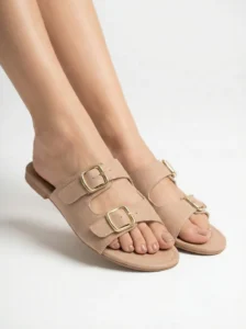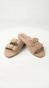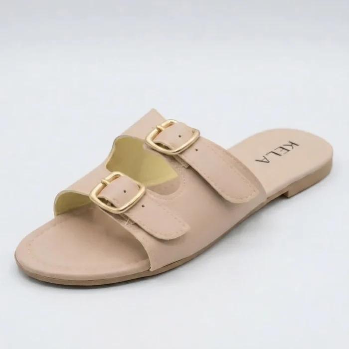 Modelo em tom nude sofisticado com duas tiras largas e fivelas douradas que trazem um toque elegante e atemporal. Confortável, versátil e fácil de combinar, é perfeita para compor looks neutros e modernos no dia a dia.