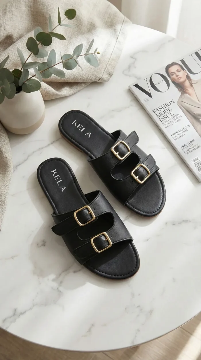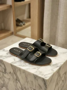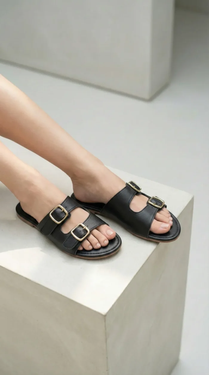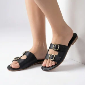 Modelo em preto sofisticado com duas tiras largas e fivelas douradas que destacam o visual. Atemporal, versátil e fácil de combinar, é perfeita para o dia a dia com conforto e elegância.