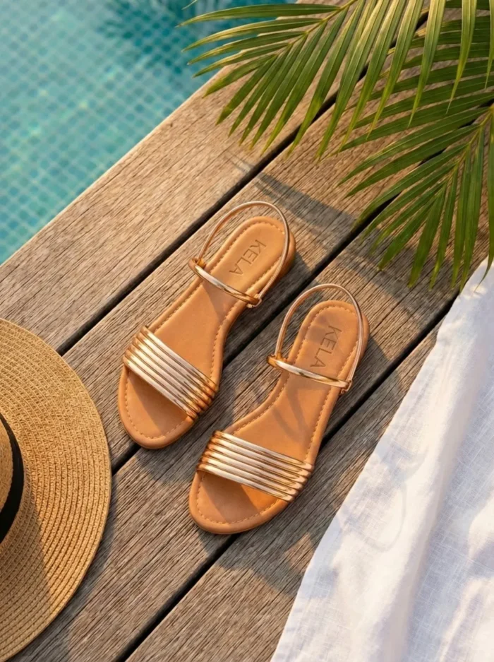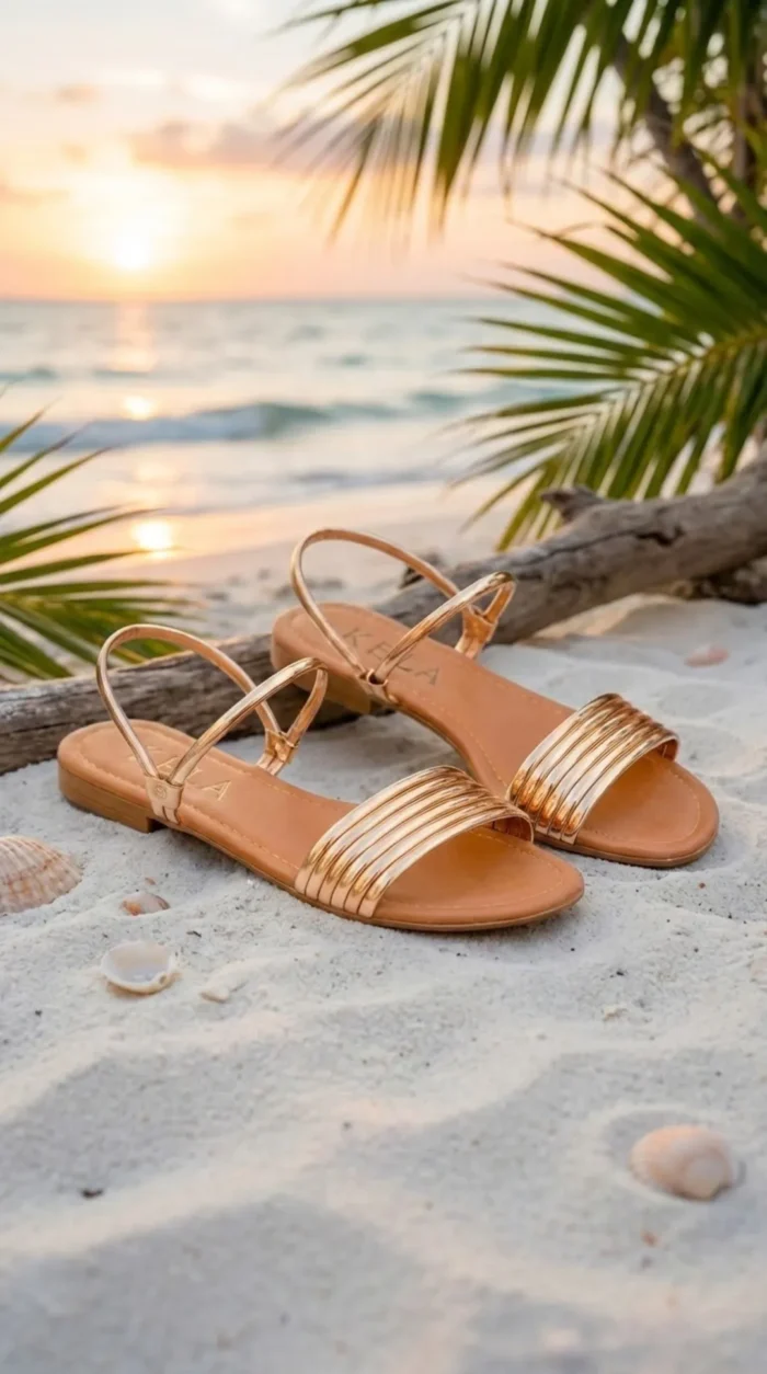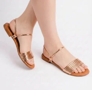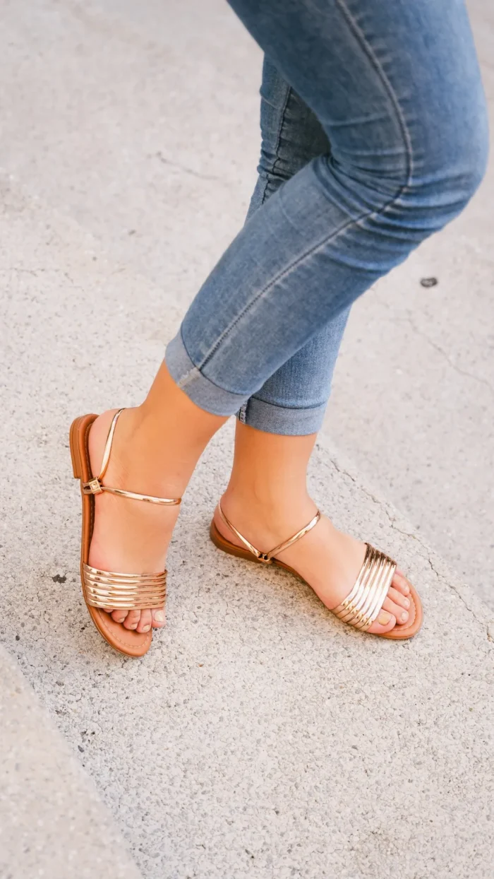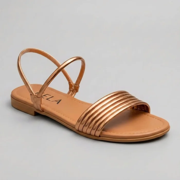 Rasteira dourada com tira frontal metalizada e ajuste no tornozelo. Moderna, versátil e super elegante — ideal para elevar qualquer look com conforto e brilho.