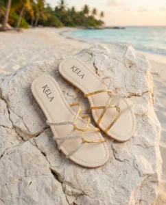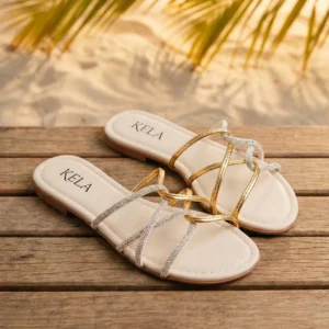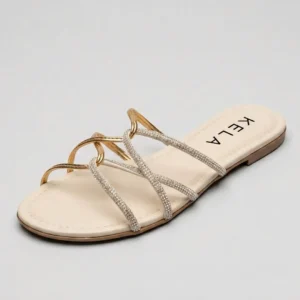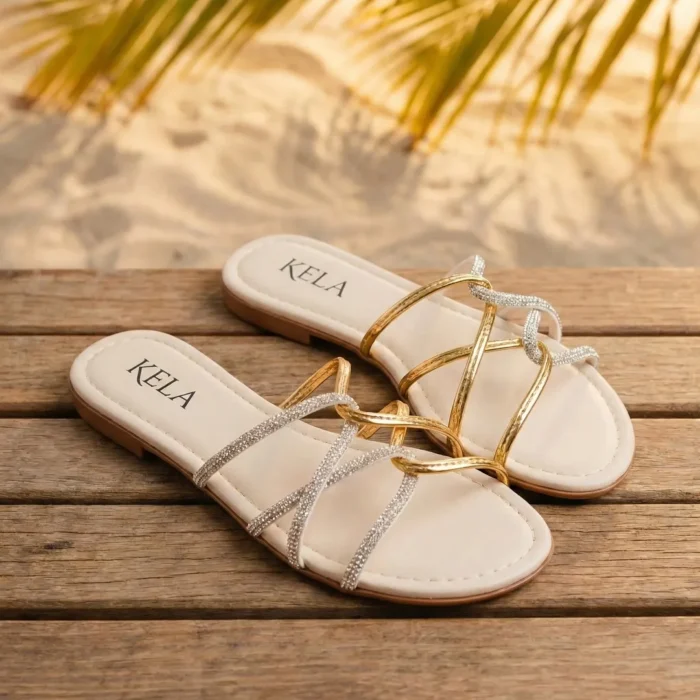 Rasteira com tiras finas douradas e prateadas em strass. Um design elegante, leve e moderno que combina brilho e sofisticação em cada detalhe.