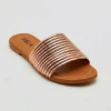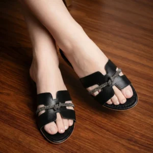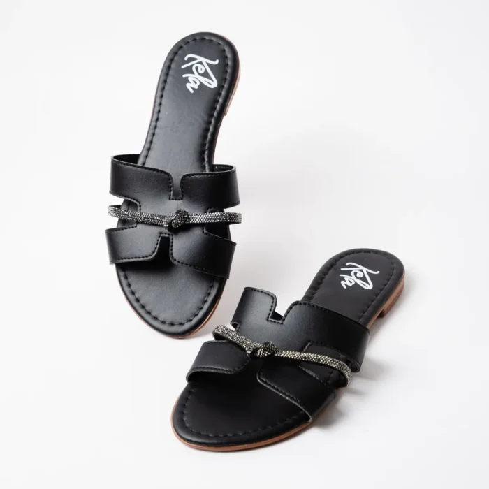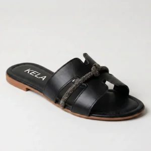 Rasteira com recorte em H e tira fina com brilho em strass. Um clássico repaginado, com design marcante e toque sofisticado para compor produções elegantes com conforto.