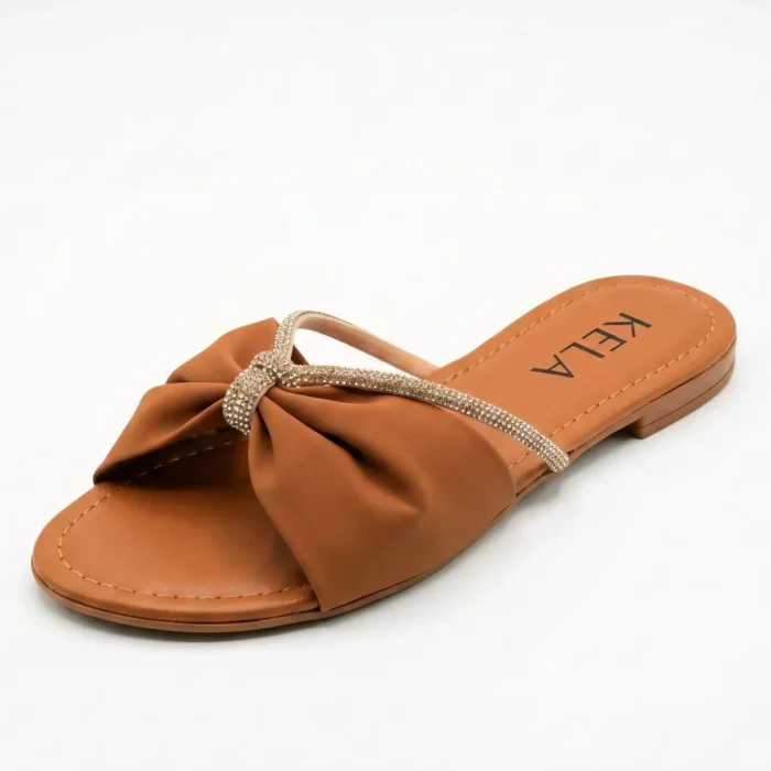 Rasteira Kela Laço Chic (K667). O equilíbrio perfeito entre romantismo e glamour! Em um versátil tom caramelo, destaca-se pela tira larga drapeada em formato de laço, arrematada por uma delicada tira de strass que cruza o peito do pé. Com palmilha macia pespontada e calce fácil, garante conforto absoluto. A aposta certa para trazer um toque refinado e elegante aos seus looks de verão!