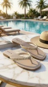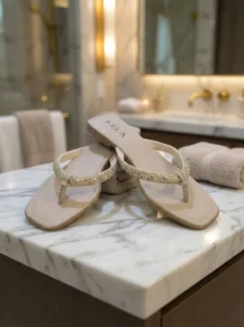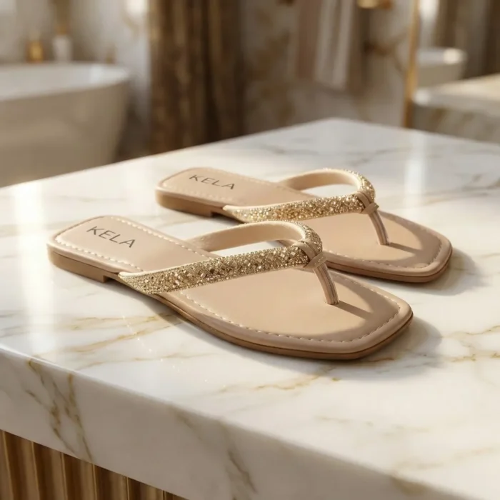 Modelo versátil em tom nude com tira frontal em brilho dourado refinado, trazendo sofisticação e leveza ao visual. Confortável e elegante, é perfeita para elevar produções do dia a dia ou compor looks mais arrumados com muito charme.