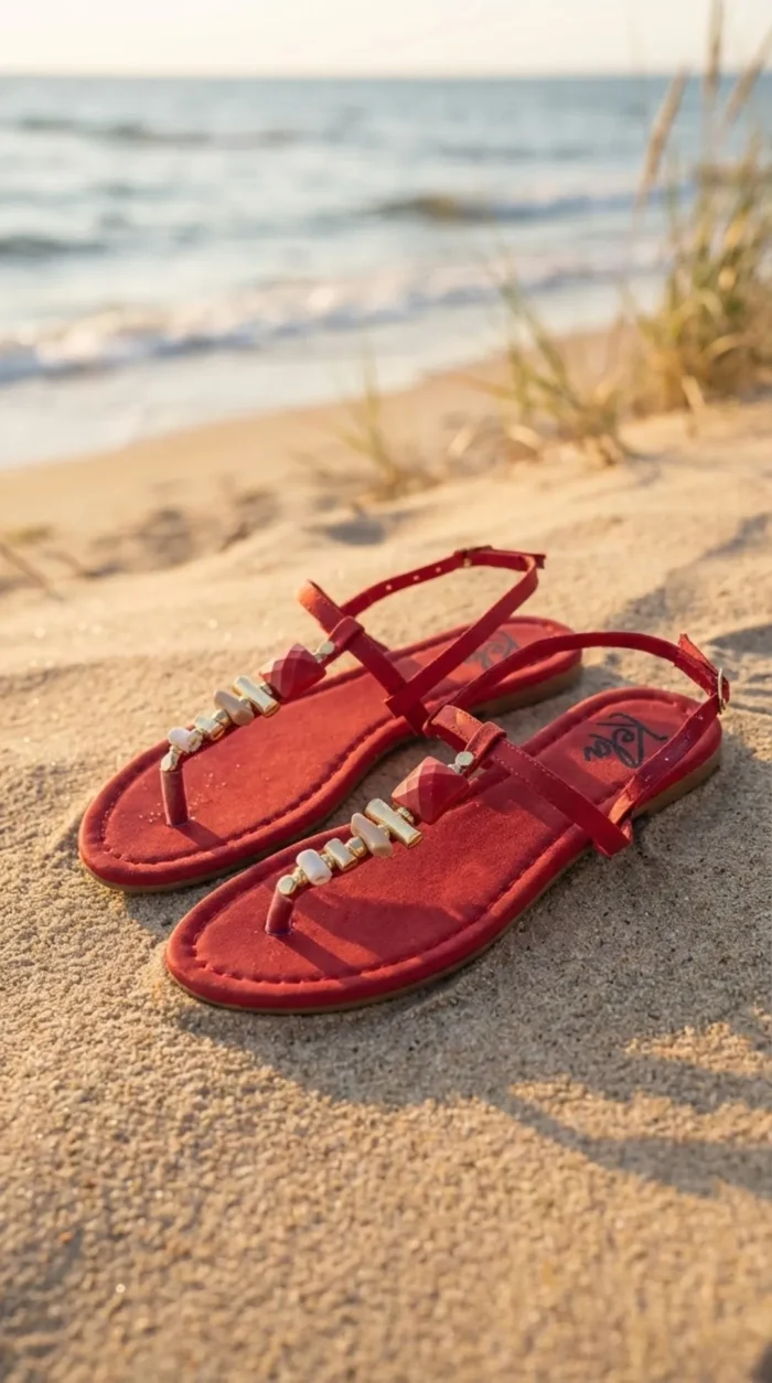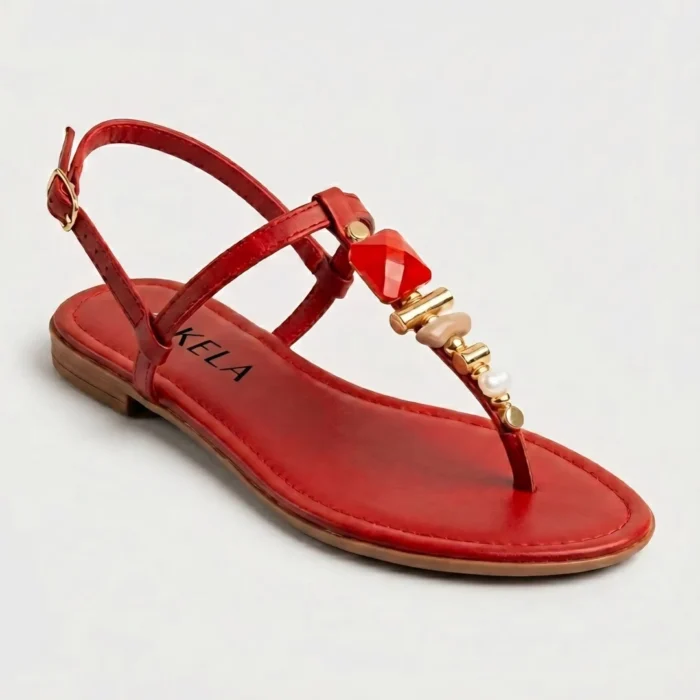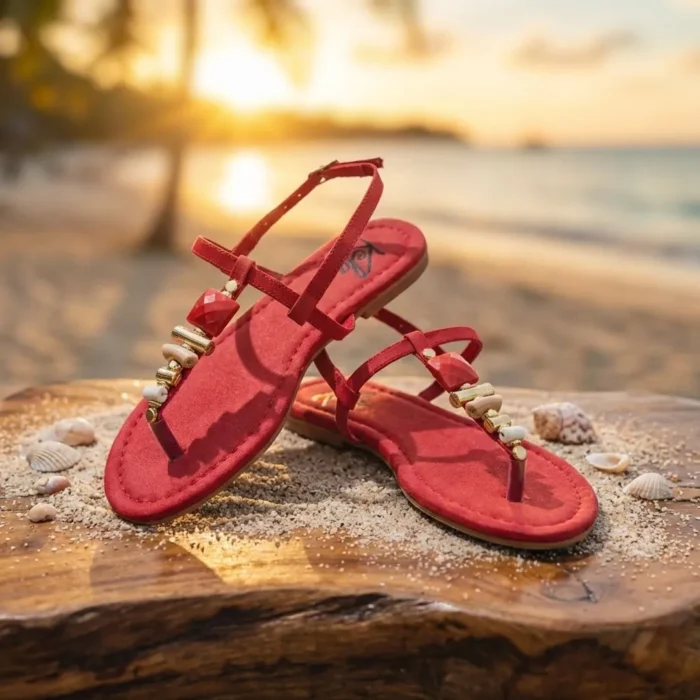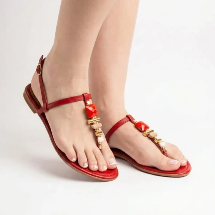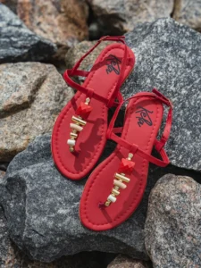 Rasteira vermelha com aplicação de pedrarias douradas. Um modelo elegante e vibrante para destacar qualquer look com muito charme e estilo.