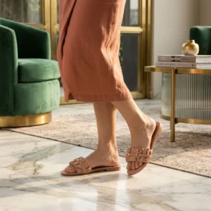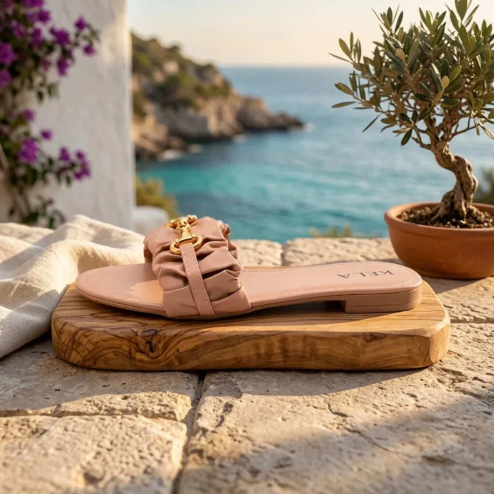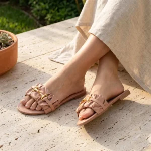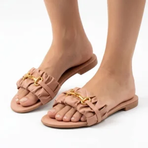 A tendência do volume aliada ao design clássico. Apostando na tira de calce fácil com acabamento franzido (estilo scrunchie), este modelo oferece um visual moderno e muito acolhedor para os pés. A imponente ferragem dourada central enriquece a sandália, criando um belíssimo contraste com o tom rosê suave. Fácil de calçar, ela é a companheira perfeita para elevar suas produções casuais com zero esforço.